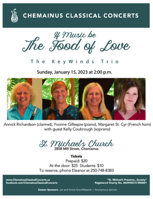 The KeyWinds Trio was joined by the amazing Canadian Soprano, Kelly Coubrough for a concert in Chemainus, BC at the historic St. Michael's Church on January 15, 2023. The concert was SOLD OUT and KeyWinds was thrilled to be able to perform to a full house. Through the ages, composers and musicians have been motivated to create music that illuminates how love, in its many forms, affects the human heart and actions. Celebrating the many facets of love, this program was made up of vocal and chamber works written by composers from the Romantic Era including Schubert, Berlioz, Donizetti, Rossini, and Voigt.